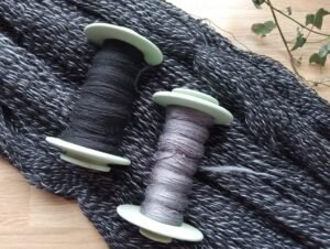 I thought I’d share my current project that I am spinning up. 200g Black Corridale singles and 100g pewter/dark grey Tussah Silk singles – plied into a monochrome candy cane (or marl). I’ll let you know how much warp yarn I manage to spin up with the 300g.