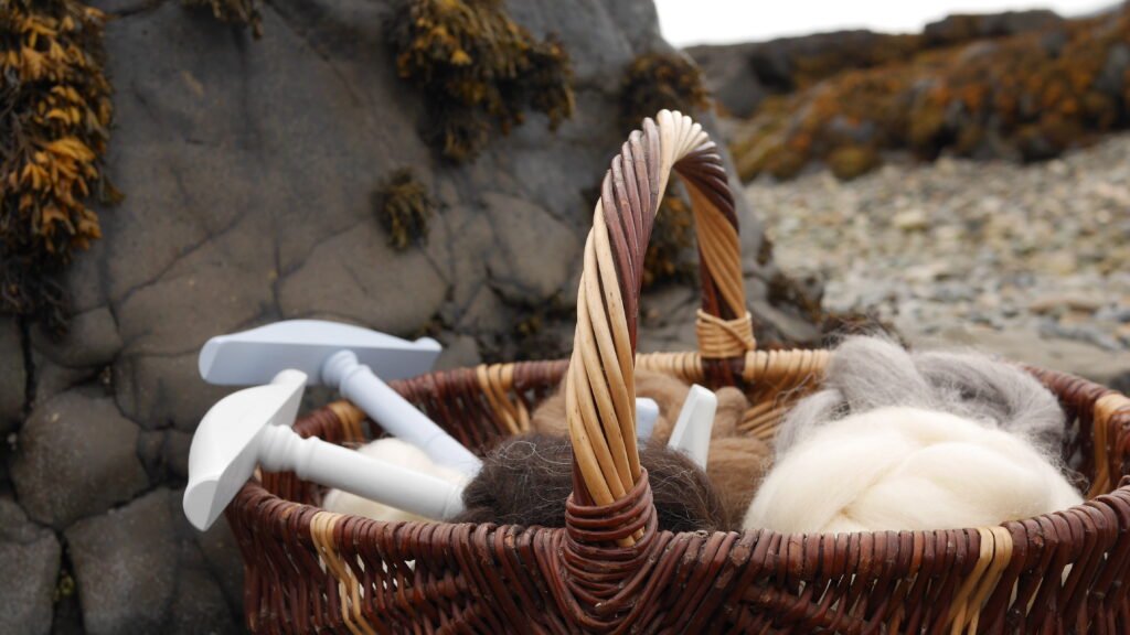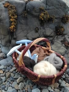 The Wooly Fibre Basket will contain a selection of regionally appropriate fibres in a range of natural colours and tones from browns and blacks to greys and white. Hebridean, Shetland and even Icelandic.